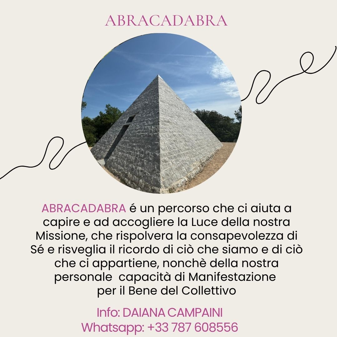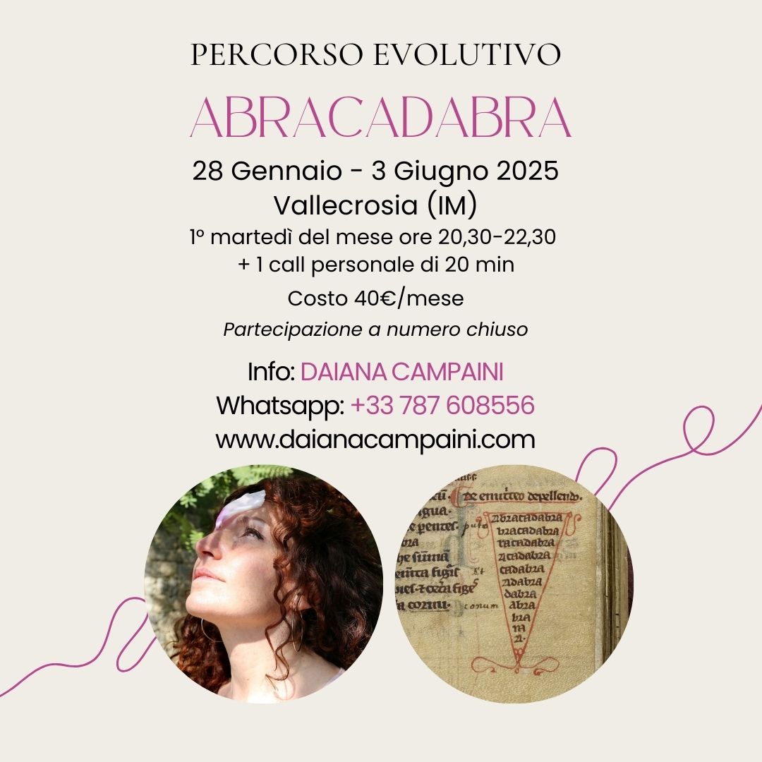 Abracadabra è una parola che si perde nell’aspetto Misterico dell’Esistenza ed in questo percorso, che il suo nome evoca, si raccoglieranno le Chiavi per aprire le Porte sulla Nostra Essenza.