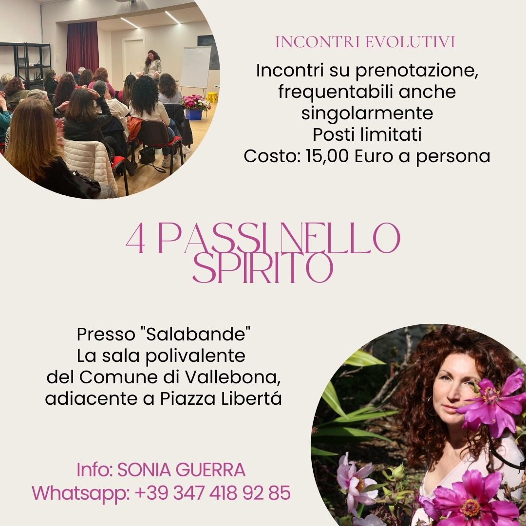 I posti sono limitati e la prenotazione assolutamente necessaria, quindi, per questa ed altre info scrivetemi una mail con oggetto “4 Passi nello Spirito” usando il bottone alla fine di questo messaggio oppure (in via più rapida) inviate un messaggio wap a Sonia al 347 418 92 85.